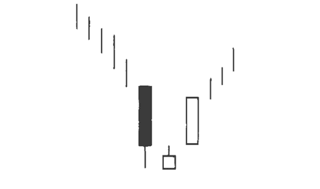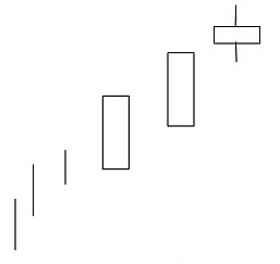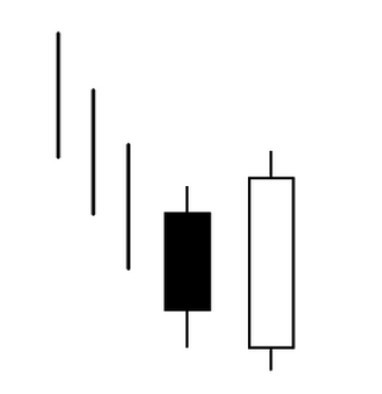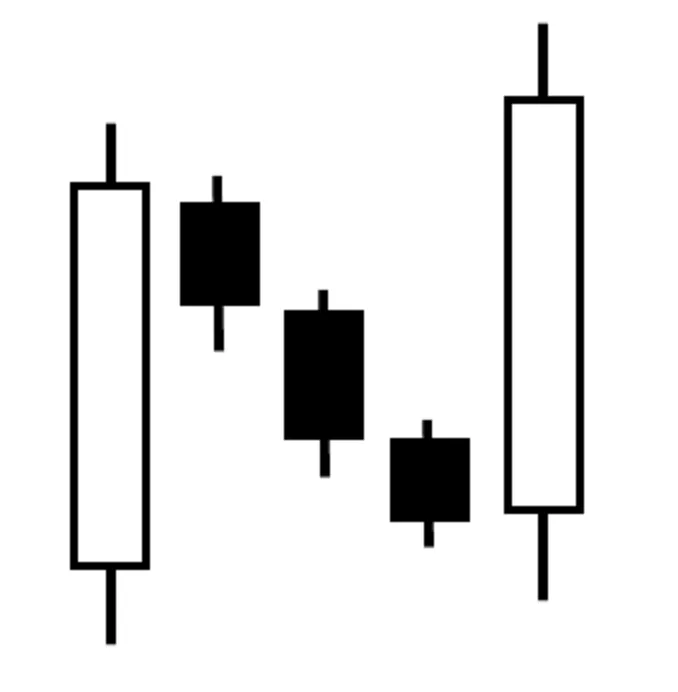 Паттерн «Три метода» состоит как минимум из пяти свечей. Он формируется, когда зеленая свеча с длинным телом предшествует трем или более красным свечам с короткими телами. Для подтверждения модели пятая свеча должна быть бычьей и закрыться выше предыдущих свечей.