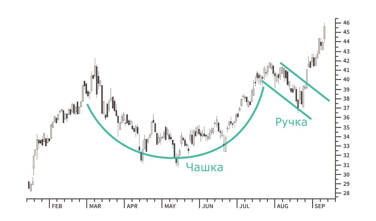Для формирования этого паттерна необходим резкий рост, а затем — небольшая коррекция, в результате которой образуется “Чашка”. После повторного отскока от уровня сопротивления, в который ранее уперлась цена, образуется “ручка”.