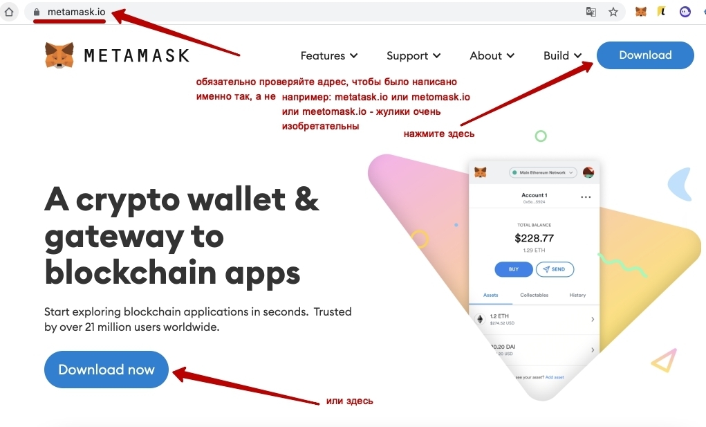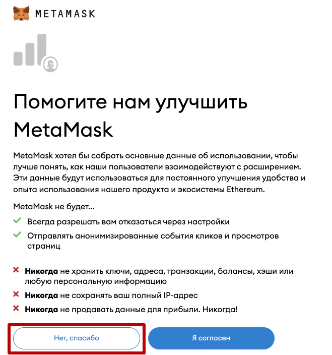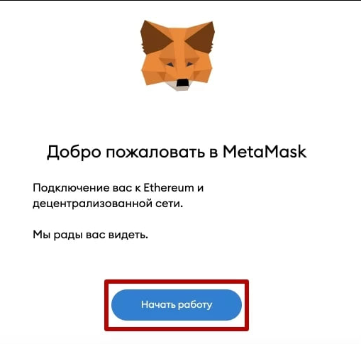 Дальше откроется окно, где нужно начать работу. Тут написано, что вы будете подключены к сети Ethereum, но на самом деле Metamask можно использовать и для подключения к другим блокчейнам, например Binance Smart Chain, Polygon (Matic), Avalanche, Velas и других.