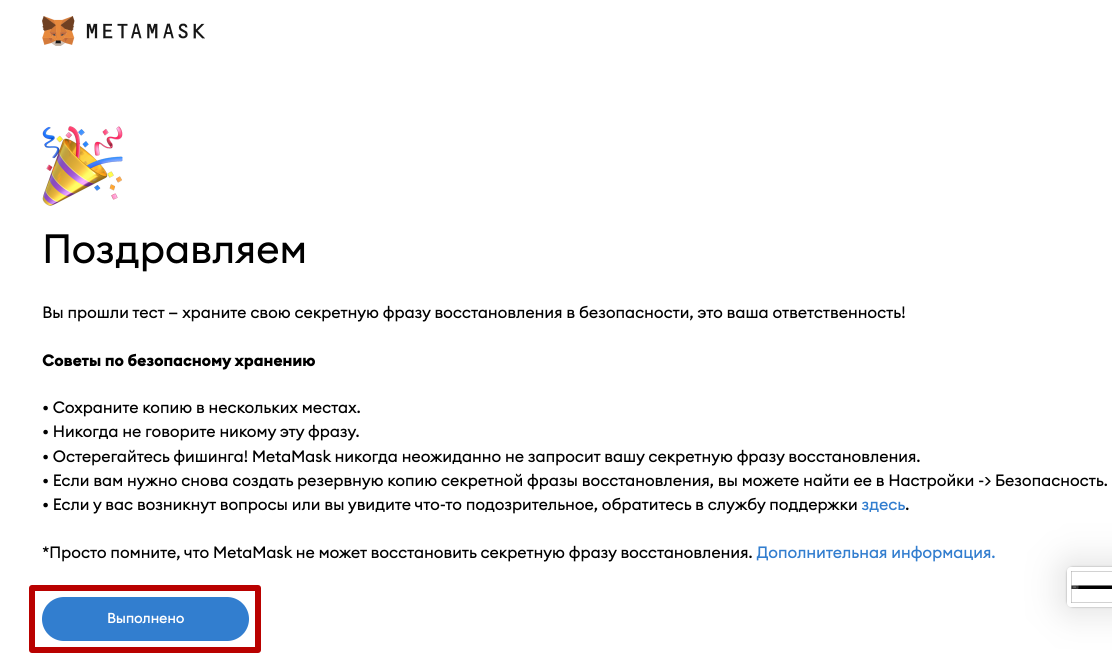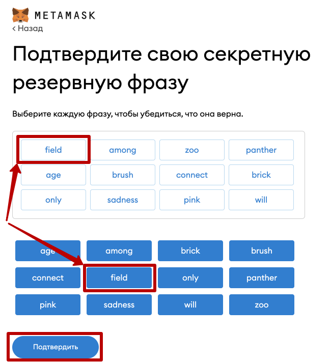 На этом этапе можно потренироваться и ввести секретную фразу именно в таком режиме, как это было бы когда вы будете восстанавливать доступ к кошельку. Но можно пропустить этот этап - он нужен для тренировки и тестирования вашего понимания.