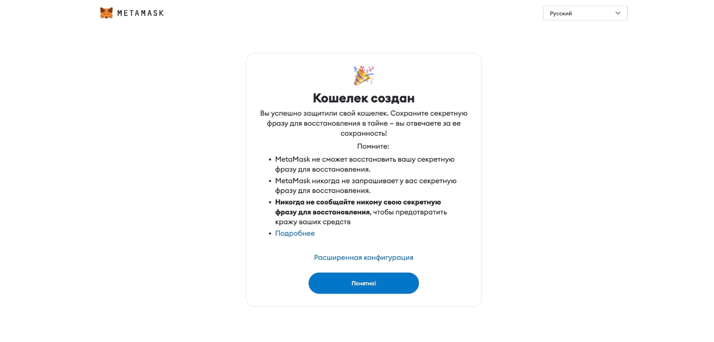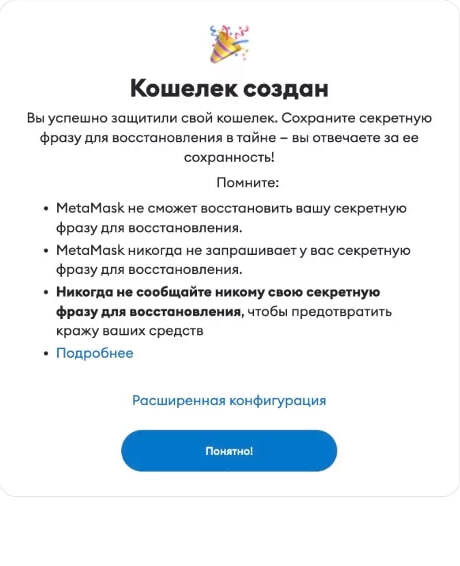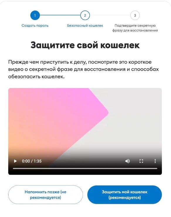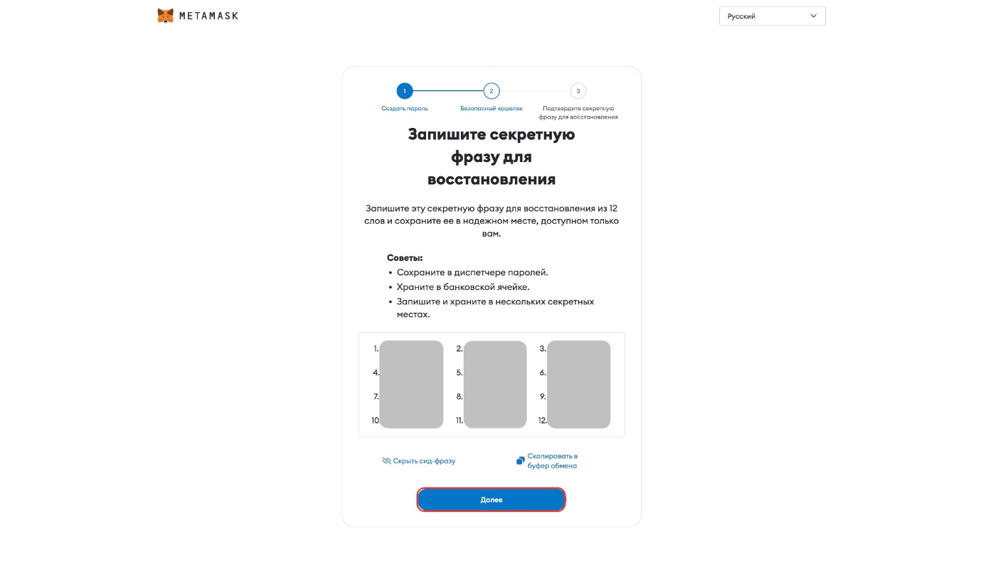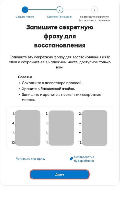 Перед переходом на следующий шаг убедитесь в правильности записей. Сохраните секретную фразу в надежном месте, так как без неё доступ к кошельку будет невозможен в случае утери пароля или устройства. С помощью этой фразы вы сможете восстановить доступ на другом устройстве или кошельке.