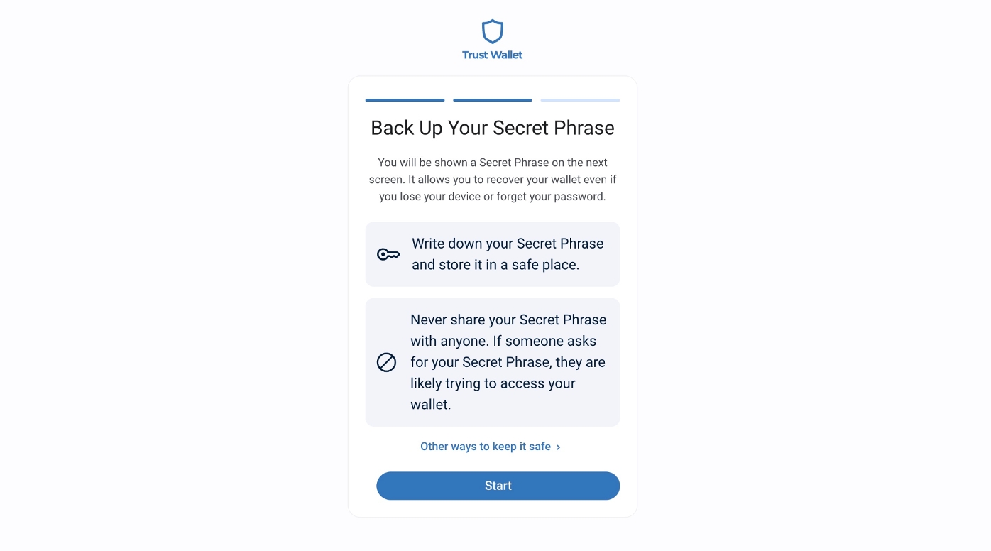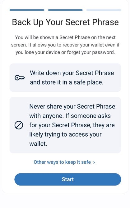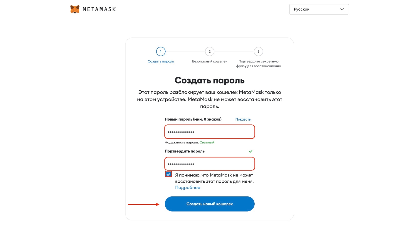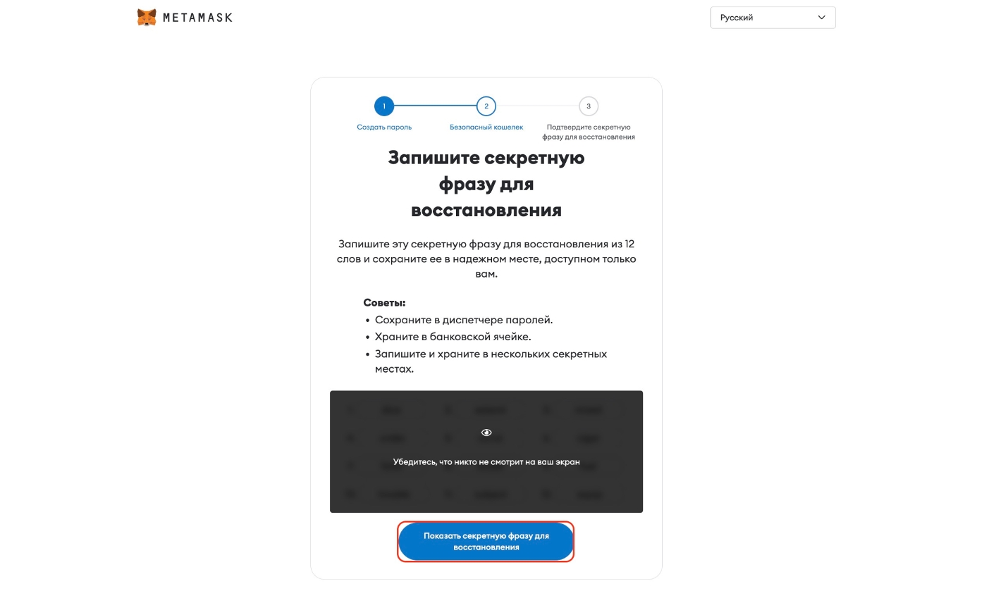 Перед переходом на следующий шаг убедитесь в правильности записей. Сохраните секретную фразу в надежном месте, так как без неё доступ к кошельку будет невозможен в случае утери пароля или устройства. С помощью этой фразы вы сможете восстановить доступ на другом устройстве или кошельке.
