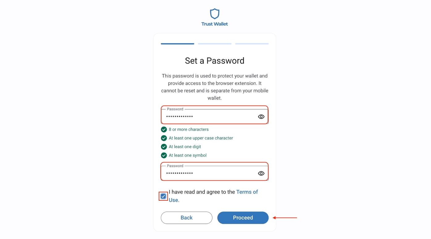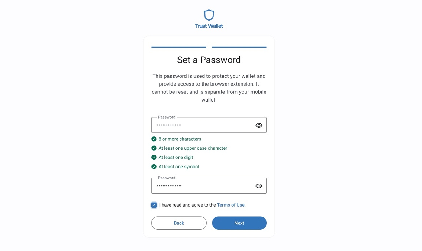 Введите пароль во второй строке, ознакомьтесь с правилами использования кошелька и поставьте галочку рядом с пунктом “I have read and agree to the Terms of Use”, после чего нажмите кнопку “Next”.