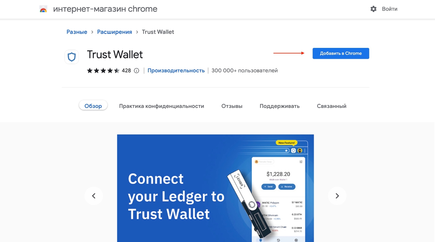На странице магазина расширений Chrome загрузите расширение кошелька Trust Wallet, нажав “Добавить в Chrome”.