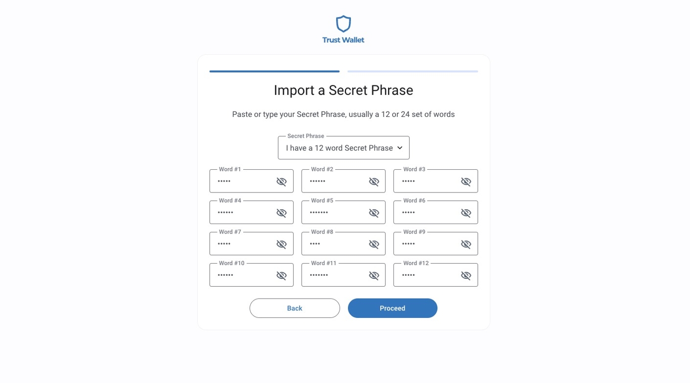 Запишите секретную фразу кошелька в том же порядке в каком вы ее получили и без ошибок — все 12 слов.